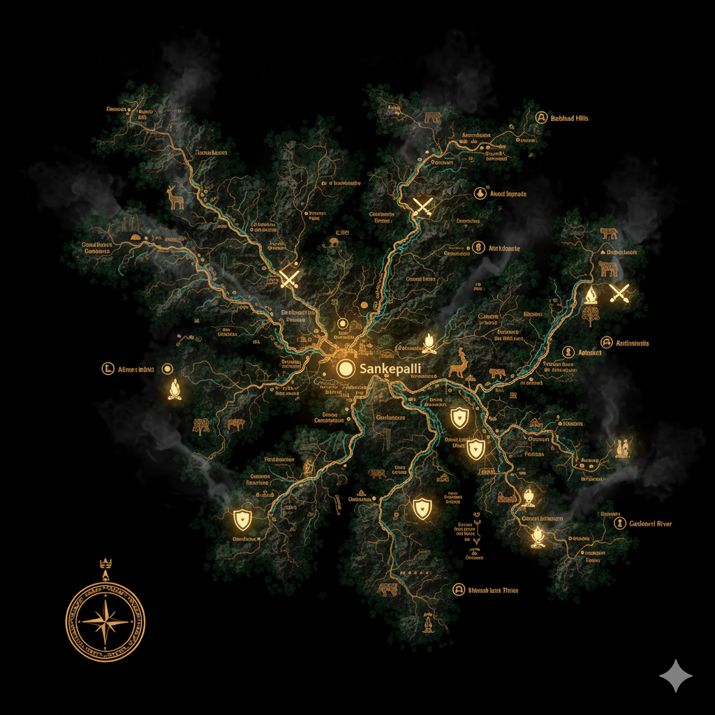 Gallery Visual Gallery of Komaram Bheem’s Life, Legacy, and Tribal Resistance Origins Early life in forests shaped his identity, values, and resistance against oppression. Uprising Tribal unity rose as Bheem challenged injustice and inspired organized resistance Resistance Guerrilla struggle defended forests, land, and dignity against Nizam’s forces. Sacrifice His martyrdom strengthened the movement and transformed loss into lasting inspiration. Legacy Ideals of Jal, Jangal, Zameen continue guiding tribal rights movements today. Remembrance Memorials, stories, and culture keep Komaram Bheem’s spirit alive. Maps Depicting Komaram Bheem’s Movement and Areas of Resistance Maps Depicting Komaram Bheem’s Movement and Areas of Resistance